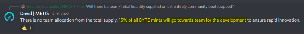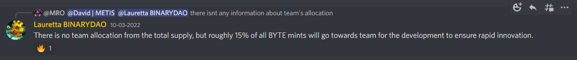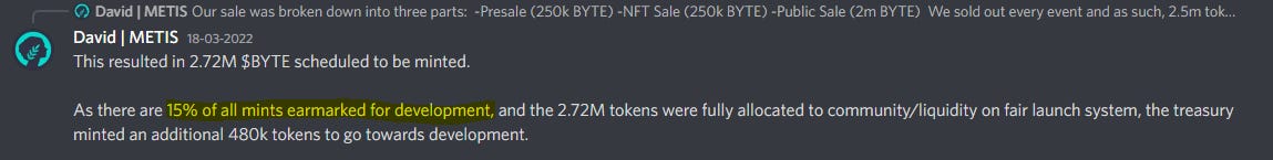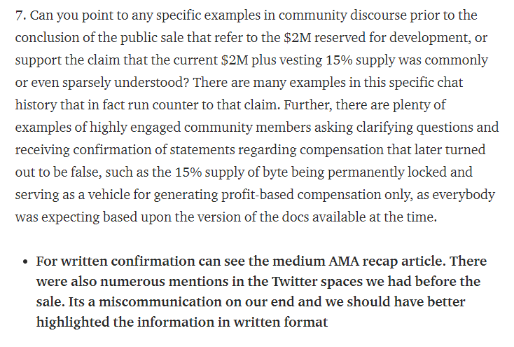 The communication on March 10th was still fishy in my opinion. Saying that there is no team allocation from the total supply during the fundraise process and then counting all BYTE’s from the fundraise as fresh mints to which the 15% applies is at the very least creative and misleading.