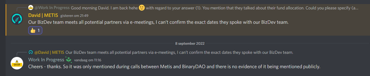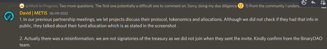 Metis explains that they didn’t check whether the BinaryDAO team made the information publicly available. They purely supported the project.