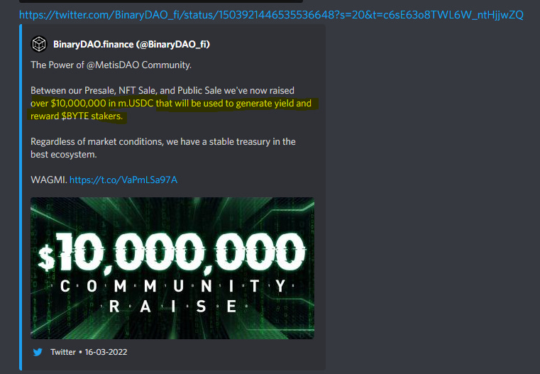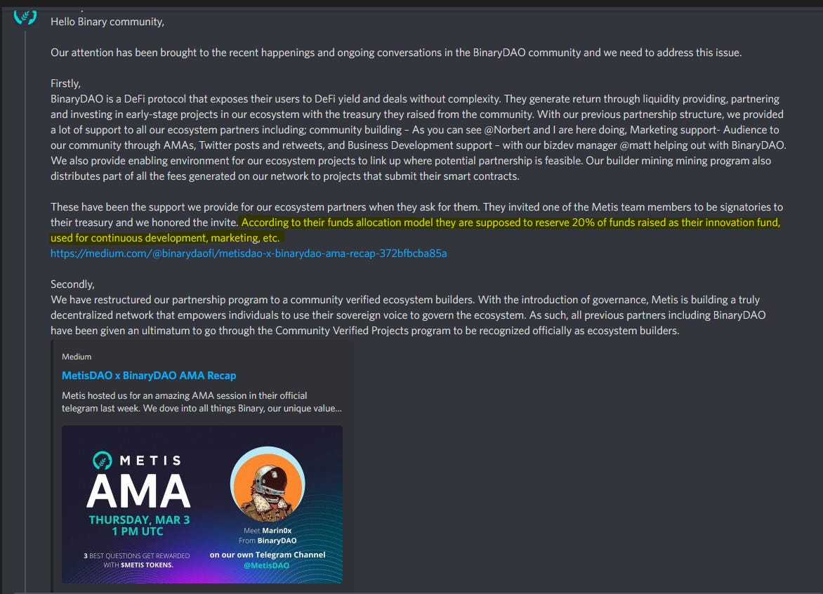 One thing that might hinder the process is that Metis might want to take more distance from BinaryDAO as a result of the shady fund-raising process they were involved with.