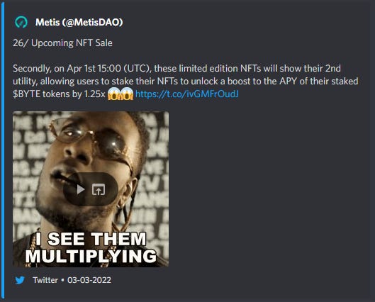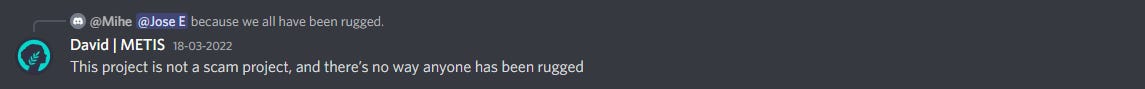 What makes it worse is Carlos Matos level shilling, the Metis team supported with. If you are helping to sell something so aggressively - you have a duty of care in my view to check the basics. Especially if you also share it via the official Metis Twitter - that creates trust for the average retail investor.