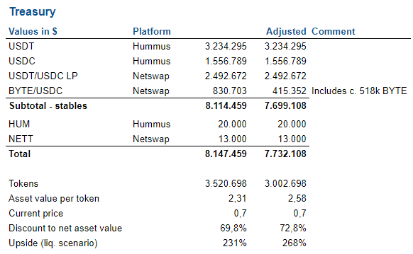 Below an overview of the treasury. It is basically fully in stables. If the protocol would be liquidated today BYTE holders would receive $2,58 per token (adjusted for the BYTE owned by the treasury as part of the BYTE/USDC LP).